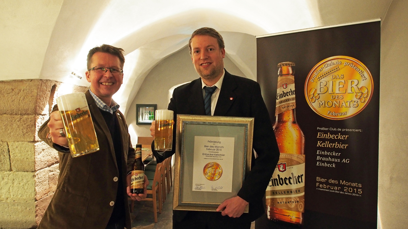 Aus dem Keller in luftige Höhen? Dieser Aufstieg könnte dem im vergangenen Jahr neu auf den Markt gebrachten Einbecker Kellerbier bevorstehen. Denn die naturtrübe Bierspezialität ist vom ProBier-Club, der mit über 6000 Mitgliedern als Deutschlands größte Konsumentenvereinigung der Braubranche gilt, zum „Bier des Monats Februar 2015“ gewählt worden – und ist nominiert für den Titel „Bier des Jahres“. Diese Auszeichnung wird seit 17 Jahren von ProBier-Club.de vergeben. Schirmherren des Wettbewerbs sind der Deutsche Brauer-Bund und der Bundesverband Private Brauereien Deutschland. In der Bierbranche ist ProBier-Club.de mittlerweile eine feste Institution, weil sich der Club für den Erhalt und die Wertschätzung von Brauereien einsetzt. Heute fand in Einbeck die Preisverleihung für das Februar-Kellerbier statt.