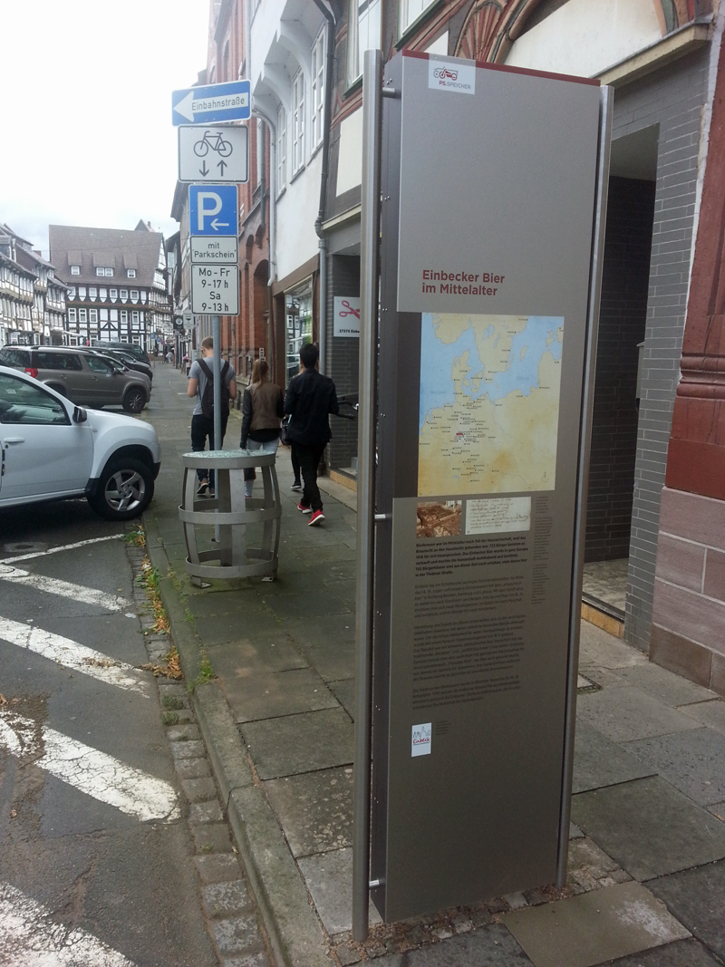Eines der Edelstahl-Schilder in der Tiedexer Straße beschäftigt sich mit dem Einbecker Bier, einen besseren Ort kann man sich auf der Distanz zwischen Tiedexer Tor und Marktplatz kaum vorstellen als vor der Fachwerk-Häuserzeile mit den großen Dielen-Torbögen-Einfahrten, durch die einst die Braupfanne ins Haus gelangte, wenn Brautag war.