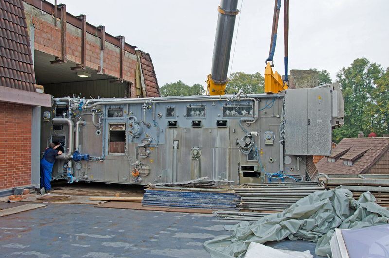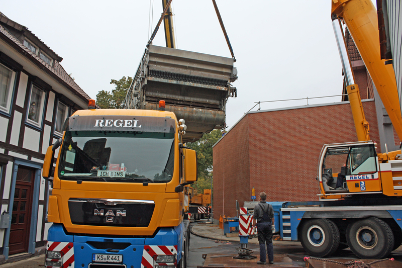 Nach 20 Jahren im Drei-Schicht-Betrieb war für sie jetzt „Schicht“: Die Einbecker Brauhaus AG hat in der Abfüllungshalle ihre bisherige „Waschmaschine“ ersetzt, die die Bierflaschen vor der Abfüllung gereinigt hat. Da die tonnenschweren Maschinen nur von Autokränen durch eine Dachöffnung aus und in die Halle gehoben werden konnten, mussten für den Maschinenwechsel die Hägerstraße zwei Tage lang gesperrt werden. Die jetzt neu eingebaute Flaschenreinigungsmaschine mit Gebindewascher für die Bierkisten stammt aus der zur Einbecker Brauhaus AG gehörenden Martini-Brauerei in Kassel. Dort wurde die 51 Tonnen schwere Maschine abgebaut und nun in Einbeck installiert, da der Abfüllbetrieb in Kassel eingestellt und die Waschmaschine dort nicht mehr benötigt wurde. Die Krones Reinigungsmaschine schafft durchschnittlich 52.800 Flaschen pro Stunde, ist energieeffizienter als der Vorgänger in Einbeck, reinigt mit heißer Lauge und Wasser und bietet nach Angaben der Einbecker Brauhaus AG deshalb optimale Hygienebedingungen ohne langwierige Reinigungsarbeiten.