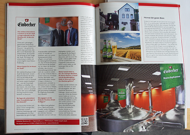 Das in einer Auflage von 2500 Exemplaren produzierte 80-seitige Heft mit dem markanten roten Umschlag („Ein Portrait für Entscheider“) dient der Standortvermarktung Einbecks als Wirtschaftsstandort und wird über Unternehmen, die Wirtschaftsförderung der Stadt Einbeck sowie durch die Einbeck Marketing GmbH eingesetzt. In erster Linie richtet sich die Broschüre an ansiedlungswillige Unternehmen und Investoren sowie potenzielle Arbeitnehmer und Neubürger der Stadt. Interessierte können die Broschüre bei Einbeck Marketing im Eicke’schen Haus kostenfrei erhalten. Im Internet kann die Broschüre ebenfalls in Kürze eingesehen werden (www.einbeck-marketing.de/wirtschaft).