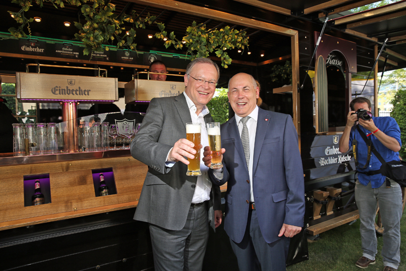 Die Einbecker waren mit der Kutsche vorgefahren… nein, die meisten Gäste waren natürlich mit dem Zug nach Berlin gefahren oder mit dem Auto. Die Brauhaus AG präsentierte aber beim Sommerfest in der Landesvertretung Niedersachsens in der Hauptstadt erstmals die neue Bockbierkutsche als Hingucker-Ausschankwagen. Gut platziert stand die Kutsche in den Ministergärten unweit der Bühne und war bei vielen Kameraschwenks in den TV-Berichten gut zu sehen. Ministerpräsident und Sommerfest-Gastgeber Stephan Weil (SPD) machte bei seiner Runde als Einbecker Bierordenträger natürlich auch am Einbecker Stand eine Bierpause und genoss mit Brauhaus-Vorstandssprecher Lothar Gauß ein frisches 1378-er.