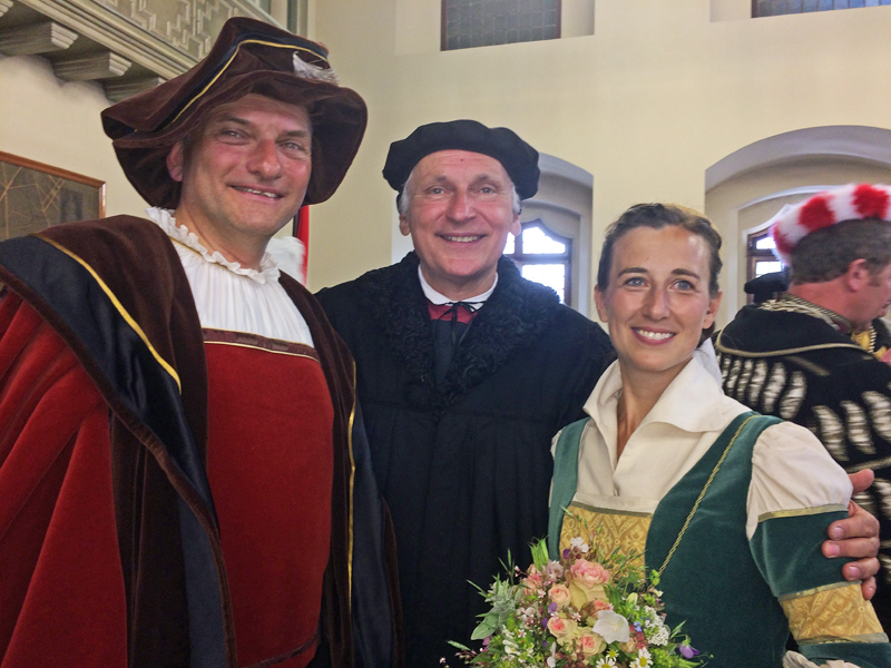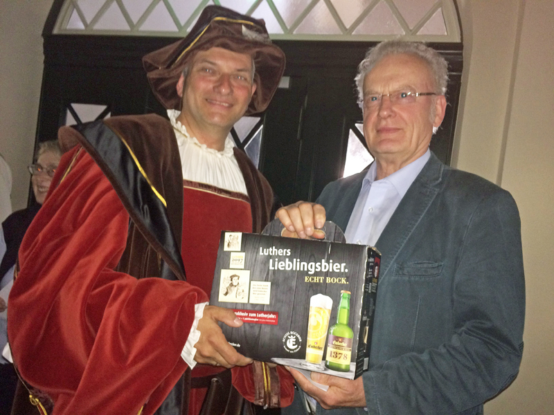 Der Rat der Stadt Wittenberg wollte einst dem Reformator etwas Besonderes kredenzen anlässlich seiner Vermählung mit Katharina von Bora. Und so schenkte der Rat Martin Luther 1525 ein Fass vom besten Bier, das einer kennt. Aus Einbeck kam das Bier auch wieder, als heuer Luthers Hochzeit in Wittenberg gefeiert wurde, ein großes Stadtfest. Zu dem sich alle in historische Gewänder kleiden. Und so waren auch die Einbecker Gäste zünftig gewandet, als sie in Wittenberg vorstellig wurden. Der Empfang durch Doctor Martinus Luther alias Bernhard Naumann und Katharina von Bora alias Katja Köhler und durch Oberbürgermeister Torsten Zugehör im Rathaus und die Übergabe des sehr gut passenden „Hochzeitsgeschenks“ an ihn und an den Ehrenbürger der Stadt Wittenberg, den Pfarrer und Bürgerrechtler Friedrich Schorlemmer haben den Einbeckern viel Spaß gemacht.