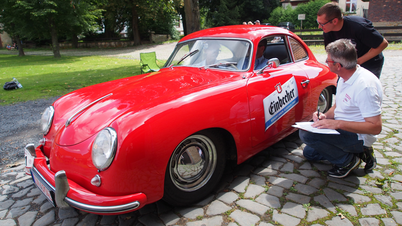 Auch in diesem Jahr war das Einbecker Brauhaus wieder markant bei der Geburtstags-Rallye des PS-Speichers rund um Einbeck dabei. Am Steuer Marketing-Vorstand Martin Deutsch, der heuer mit Ehefrau Petra in einem roten Porsche 356 aus dem Jahr 1951 die rund 120 Kilometer lange Tour durch die Region bewältigte – und am Ende in seiner Baujahrklasse den zweiten Platz hinter PS-Speicher-Stifter Karl-Heinz Rehkopf belegte. „Einbecker auf Tour“ war natürlich mit bleifreier „Blaubier“-Werbung am Start, fuhr für Einbecker Brauherren alkoholfrei. Anfangs meinte es das Rallye-Wetter nicht gerade gut mit den Einbecker Geburtstagskindern vom PS-Speicher. Das nasse Wetter bescherte auch zwei Ausfälle, Martin Deutsch auf Porsche 356 hielt jedoch bis zur Ziellinie durch. Bei der Route durch die Region mussten die Fahrer und Beifahrer mit ihren Fahrzeugen an fünf Orten originelle Wertungsprüfungen absolvieren, die sie vorher nicht kannten. Geschicklichkeit beweisen mussten die Oldtimer-Steuerer, als sie möglichst nah an eine Holzstange heranfahren sollten. In Moringen auf dem Domänenhof galt es, den Durchmesser des eigenen Lenkrades zu schätzen. Viele PS-Piloten lagen dabei gut im Rennen. So wie Martin Deutsch, der die 40 Zentimeter exakt schätzte.