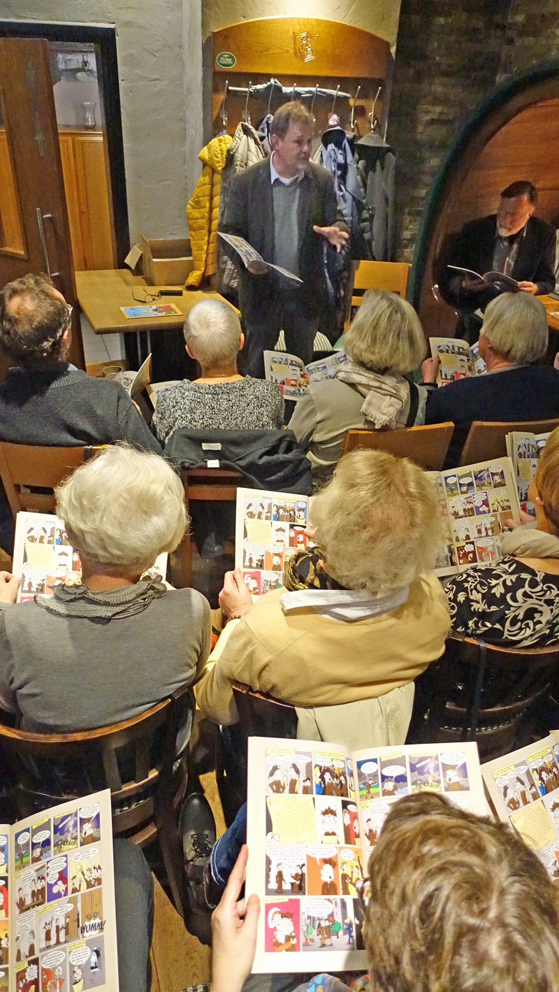 Bevor Gralle las, hatten die Besucher der Veranstaltung alle einen Comic auf ihrem Schoß. Denn Thomas Dahms stellte sein „Zu Tisch bei Luthers in Wittenberg“ vor, und der Verleger und Autor des Ostfalia-Verlages zeigte sehr praktisch, dass auch Lesungen aus einem Comic sehr gut möglich sind. Bei dem gezeichneten Bilderbuch über Luthers kann man übrigens nebenbei eine Menge lernen. Auch im Comic kommt selbstverständlich Einbeck und sein Bier vor, schließlich war es leckere Gabe bei der Luther-Hochzeit. Nach so viel literarischen Genüssen konnten sich die Gäste an kulinarischen laben. Das Team des Brodhauses um Conny Schlöter kredenzte ein Drei-Gang-Menü und hatte selbstredend die korrespondierenden Einbecker Biere im Ausschank. Mit der passenden Lektüre konnten sich die Besucher schließlich am Büchertisch von Buchhändlerin Gudrun Buschold (Einbecker Literaturhaus) versorgen. Wirklich schade wäre es, wenn es bei dieser einen literarisch-kulinarischen Kombination bliebe, ähnliche Veranstaltungen sind gut denkbar: Beispielsweise gibt es ja auch Einbeck-Krimis, die ebenfalls ihre Szenen im Brodhaus haben. Und dass der eigene Einbeck-Comic überfällig ist, dürfte spätestens an dem Abend im Brodhaus auch jedem klar geworden sein.