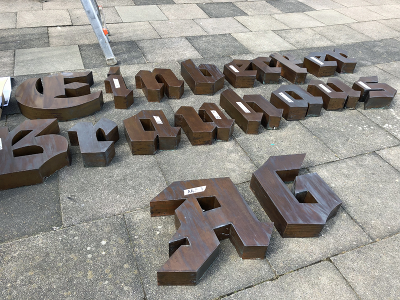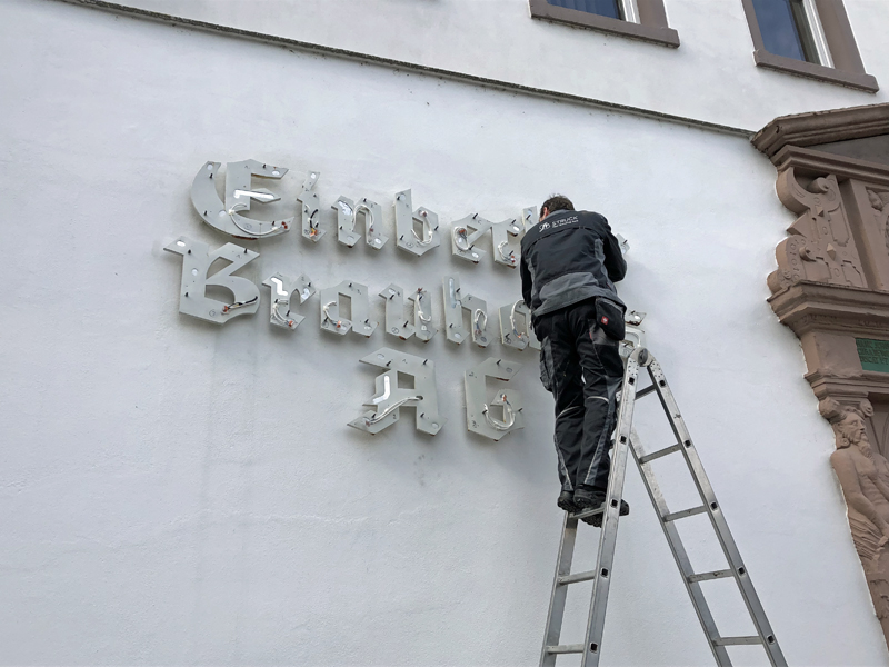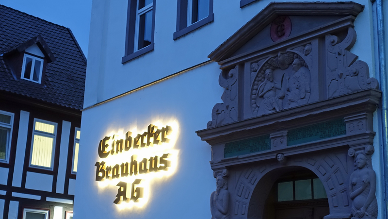 Frühlingsfrisch: Die Buchstaben am Eingang der Brauerei leuchten und glänzen wieder. Kein Wunder, sind sie doch gereinigt und mit frischerem Licht versehen worden. Jetzt strahlt das „Einbecker Brauhaus AG“ wieder wie neu. Modernes LED-Licht lässt den Schriftzug nun leuchten, nachdem er von Mitarbeitern der Firma Struck („Wir bringen ihre Marke zum Leuchten“) aus dem ostwestfälischen Steinheim gereinigt und montiert worden ist; die Oxidation hat man so belassen. Die 19 Buchstaben aus Kupfer prangen schon seit dem großen Umbau 1968 an der Fassade der Verwaltungsgebäudes am Eingang zum Gelände des Brauhauses an der Papenstraße, wo vorher ein Fenster war. Ganz genau weiß man das nicht mehr, aber ein Fotovergleich legt das nahe. Markant auch das Portal der ehemaligen Ratsschule daneben; die Schule war 1826 abgebrannt, die schmuckvolle Eingangstür (durch die man nicht hindurch gehen kann) wurde am Brauereigebäude erhalten. Dann kann das Hoffest 2018 am 28. April kommen.