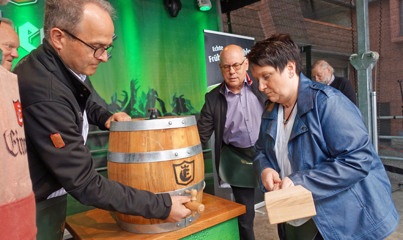 Man gebe Sportreporterlegende Rolf Töpperwien ein Mikrofon. Und er redet natürlich über Fußball. Auf der Bühne der Einbecker Brauhaus AG sprach der in Osterode geborene 67-Jährige zur Eröffnung des Hoffestes 2018 dann aber auch schnell über das Einbecker Bier. Das kennt der Kultkommentator schon aus Göttinger Studententagen. „Einbeck spielt in der Champions League, hat das beste Maibock weltweit“, dröhnte Töpperwien. Eine meisterhafte Leistung zeigte auch ganz ohne Training die stellvertretende Bürgermeisterin beim offiziellen Anstich des ersten Fasses Einbecker Mai-Urbock auf der Hoffest-Bühne: Zwei souveräne Schläge versetzte Antje Sölter dem Zapfhahn mit dem Holzhammer, schon floss problemlos der Gerstensaft aus dem Hahn in die Krüge – und spritzte und schäumte nicht wie vergangenes Jahr bei Bürgermeisterin Dr. Sabine Michalek. Präpariert sei das Fass heuer nicht gewesen, versicherten die Brauhaus-Vorstände Lothar Gauß und Martin Deutsch, die wie vergangenes Jahr bei der Zeremonie zur Seite standen. Antje Sölter habe eben den Holzhahn optimal getroffen und nicht mit dem Zapfen abgeschlagen…