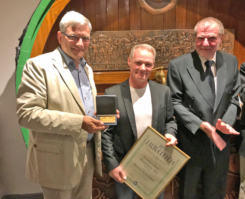 Der Goldene Bierdeckel 2018 geht an Bernd Schröder. Der 1964 geborene Sammler aus Ludwigslust setzte sich aus dem Dreier-Vorschlag am Ende durch. Der IBV, der Internationale Brauereikultur-Verband, hat die Auszeichnung bei einem Festabend im Urbockkeller der Einbecker Brauhaus AG verliehen. In Einbeck fand am Wochenende das Tauschtreffen des Vereins statt, das Sammler aus ganz Deutschland und darüber hinaus anzog. Die Brauhaus AG bekam den Dank für die Verleihungsmöglichkeit des Goldenen Bierdeckels.