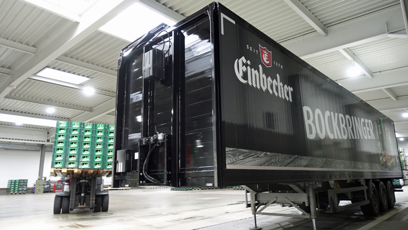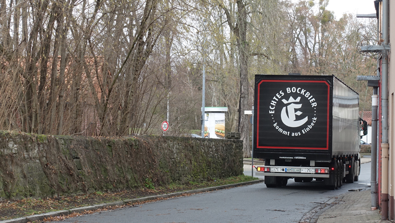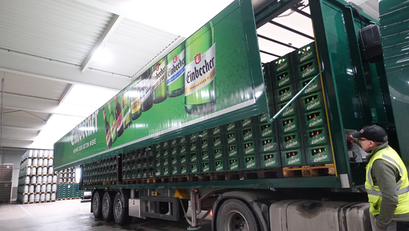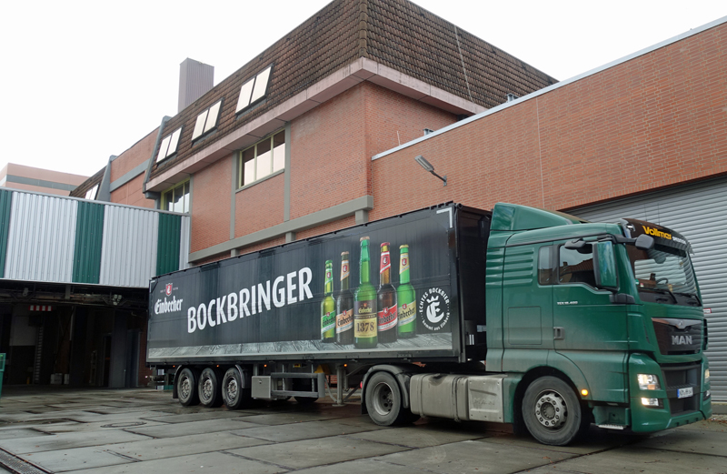 Sie sind präsent im Stadtbild, denn sie sind werktags ständig von morgens bis zum späten Nachmittag unterwegs: die Shuttle-Lkw der vom Einbecker Brauhaus beauftragten Spedition, die die Brau- und Abfüllstätte in der Papenstraße mit dem Logistikzentrum in der Hansestraße verbinden. Die 40-Tonnen-Lkw-Auflieger, in die fünf Gabelstapler-Ladungen hinein passen, strahlen im neuen Design. Alle drei Auflieger sind komplett neu und können auf dem innerbetrieblichen Transport durch das westliche Einbeck glänzen. Jeder Fahrer ist mehr als 20 Mal pro Werktag auf der Pendelstrecke unterwegs. Einer der drei Auflieger ist als „Bockbringer“ im schwarzen Bockbier-Design auf der Straße, die anderen beiden Auflieger leuchten im Einbecker Grün. Die Zugmaschine bringt den Auflieger aus Richtung Neustädter Kirchplatz durch die Brauerei, quasi auf der historischen Papenstraße, und nimmt aus der Verladehalle einen anderen Auflieger mit. Hinter der Verladehalle verlässt der Lkw nach diesem Tausch die Brauerei wieder über die Hägermauer in Richtung Logistik.