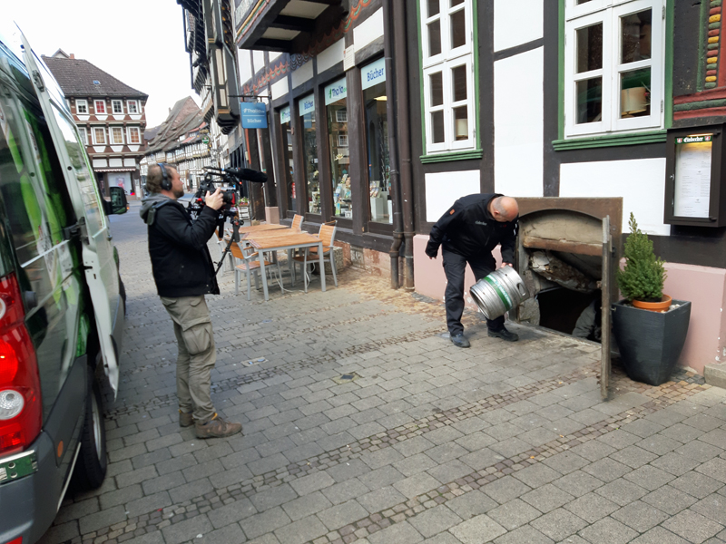Wie kommt eigentlich das Einbecker Bier von der Brauerei ins Brodhaus? Diese Frage (und noch so einige mehr) beantwortet NDR-Reporter Sven Tietzer in der nächsten Folge von „Tietzer reist…“. Das Team des Norddeutschen Rundfunks war für Dreharbeiten am Montag in Einbeck, besuchte die Verladehalle im Brauhaus und die Fassabfüllung, die Fassanlieferung durch den Einbecker Bierfahrer Thorsten Blawe (Einbecker Getränke) und den Bierausschank durch Conny Schlöter im Brodhaus am Marktplatz. Sven Tietzer packte natürlich wieder oft selbst mit an, probierte vieles aus. Schornsteinfegermeister Marco Strohmeier (Holtershausen) zeigte dem NDR-Team die besten Blicke „über den Dächern von Einbeck“, und mobil wurde es im Lkw-Depot des PS-Speichers auch noch, unter anderem in einem ehemaligen Übertragungswagen des NDR. Am Ende soll aus dem umfangreichen Sendematerial eine etwa achtminütige, lockere Reisereportage entstehen, Impressionen aus der Einbecker Innenstadt inklusive. Der NDR wird „Tietzer reist…“ am Freitag, 29. März 2019, im Nachmittagsprogramm von 16.20 bis 17.10 Uhr senden, teilte heute das Einbecker Brauhaus mit.