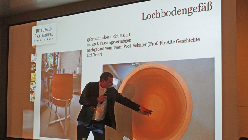 Dr. Stefan Hanke, Leiter der Bitburger Versuchsbrauerei, schilderte die interessanten Versuche unter Federführung der Hochschule Trier, ausgehend von der altorientalen so genannten Ninkasi-Hymne mit Hilfe eines nachgebauten Lochbodengefäßes zu maischen und gären zu lassen, am Ende wie im Mittelalter Bier herzustellen und sozusagen nebenbei aus dem entstehenden Treber ein Brot zu backen.