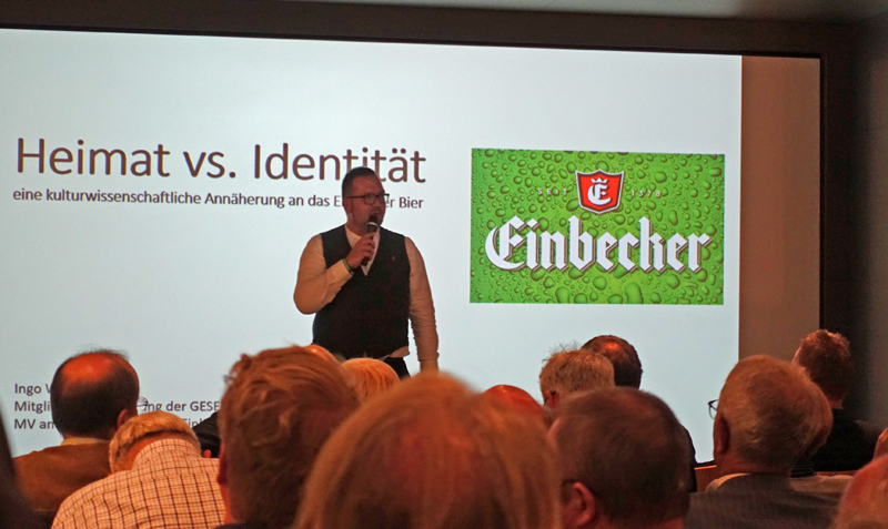 Ingo Weidig, wissenschaftlicher Mitarbeiter im Einbecker PS-Speicher, nahm sich der Einbecker Biergeschichte an und arbeitete in seinem kulturwissenschaftlichen Vortrag („Heimat vs. Identität“) heraus, wie viel Einbeck im Einbecker steckt (eine ganze Menge, das Einbecker E sei allgegenwärtig).