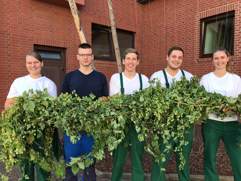 Erste Ernte mit einem hopfigen Ernterankfest: Ein wenig spät waren die Azubis ja schon dran, Erntezeit für den Hopfen ist üblicherweise Anfang bis Mitte September. Aber es war ja auch das erste Mal, dass sie eigenhändig echten Hopfen (lat. humulus lupulus) im neuen Hopfengarten auf dem Brauereihof in Einbeck ernten konnten. Seit dem Frühjahr haben sich Amelie Claus, Julien Wilkens, Luca Dalkner, Justus Kaspereit und Viviane Hippauf in eigener Verantwortung um den brauereieigenen kleinen Hopfengarten gekümmert. Wilkens absolviert eine Ausbildung zum Elektroniker für Betriebstechnik, die anderen lernen im traditionsreichen Lehrberuf Brauer und Mälzer. Nebenbei haben alle viel über die Bedürfnisse der Hopfenpflanzen gelernt. Wichtig sind ausreichend Sonne, eine hohe Bodenfeuchte und ein möglichst tiefgründiger, gut durchwurzelbarer Boden. Viviane Hippauf: „Beim Gießen haben wir uns abgewechselt“.