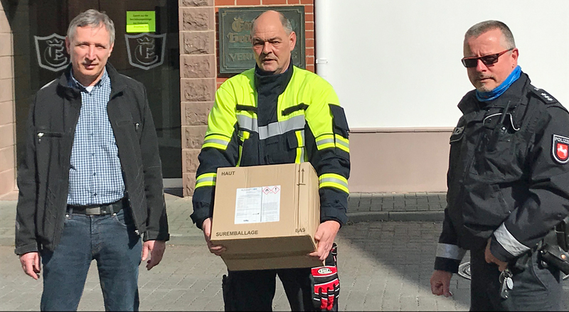Solidarität in Zeiten der Corona-Pandemie: Hans Denk, Leiter Instandhaltung des Einbecker Brauhauses, hat einen Karton mit 20 Litern Desinfektionsmittel an Stadtbrandmeister Lars Lachstädter (Feuerwehr Einbeck) und Hauptkommissar Torsten Müller (Polizei Einbeck) als Spende übergeben. Das gebrauchsfertige und selbsttrocknende Mittel auf Ethanolbasis dient in der Lebensmittelindustrie zur wirksamen Desinfektion von technischen Oberflächen. Es soll nun zum fortlaufenden Desinfizieren der Feuerwehrgerätschaften und des Empfangstresens der Polizeistation sowie der Bedienelemente der Funkstreifenwagen zum Einsatz kommen, teilte das Einbecker Brauhaus in einer Presseinformation mit. „Das ist eine Geste der praktizierten Solidarität in unserer Region“, erklärte Denk. Lars Lachstädter und Torsten Müller verbanden ihren Dank an das Einbecker Brauhaus mit einem gemeinsamen Appell an alle Bürger, die Infektionsgefahr durch das Coronavirus durch umsichtiges Verhalten zu verringern und die Regeln einzuhalten.