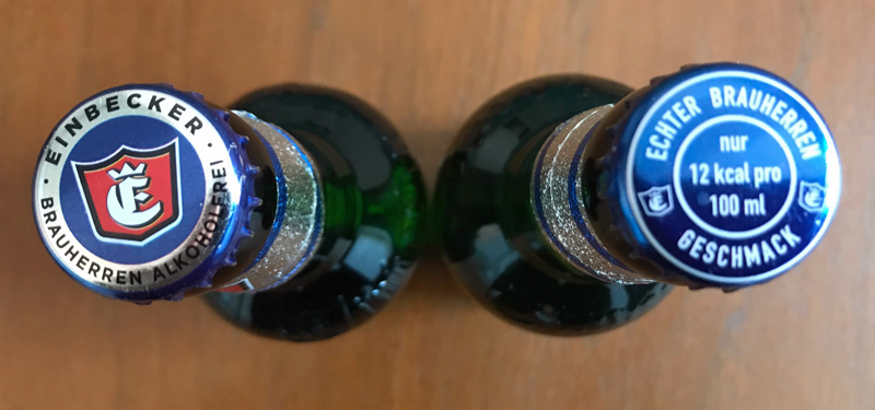 Neben ein wenig Lyrik treten auf den neuen Rücken-Etiketten Angaben zum Brennwert inklusive Kalorienangabe hinzu. Beim alkoholfreien Bier war das bislang schon so, denn für alle Getränke mit weniger als 1,2 Volumenprozent Alkohol schreibt der Gesetzgeber seit 2014 verpflichtend vor, dass in der Deklaration Energiegehalt, enthaltenes Fett, ungesättigte Fettsäuren, Kohlenhydrate, Zuckergehalt sowie die enthaltene Menge an Eiweiß und Salz enthalten sein muss. Beim Brauherren Pils alkoholfrei ist bei den durchschnittlichen Nährwertangaben je 100 ml 12 kcal / 23 g Kohlenhydrate angegeben. Bei Fett, Fettsäure, Zucker, Eiweiß und Salz steht dort korrekterweise jeweils „0 g“. Die Konsumenten können jetzt aber nicht nur auf den Flaschenaufklebern erkennen, dass Einbecker Brauherren alkoholfrei 12 kcal/100ml beinhaltet. Das steht jetzt auch auf neuen blauen Kronkorken, mit denen einige (aber nicht alle) Bierflaschen nun verschlossen werden. „Das Einbecker ist deutlich kalorienärmer als fast alle anderen alkoholfreien Biere“, betont Meiser. Durchschnittlich hat ein alkoholfreies Bier 26 kcal. Dieses besonders kalorienarme Einbecker entsteht durch das aufwändige, zweistufige Entalkoholisierungsverfahren im Einbecker Brauhaus. Und dass Bier kalorienärmer beispielsweise als Milch, Wein oder Orangensaft ist, zeigt eine Übersicht des Deutschen Brauer-Bundes.