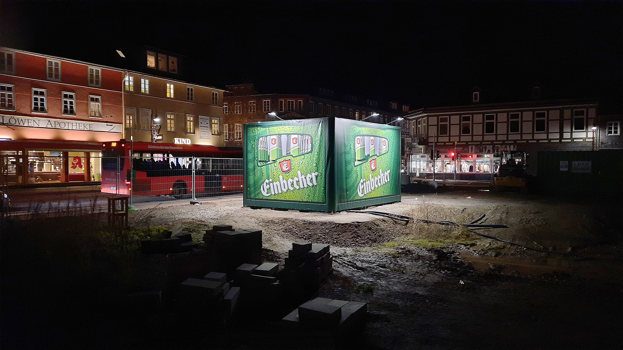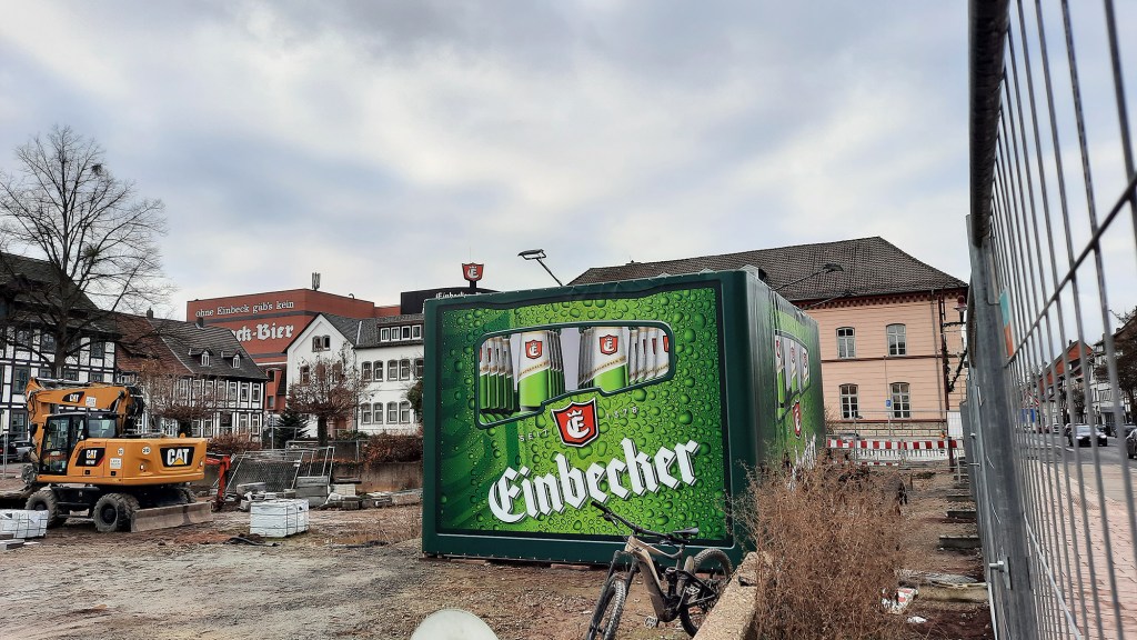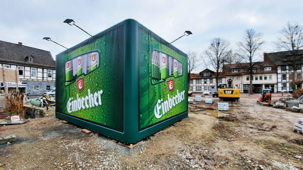 Brauerei-Vorstand Martin Deutsch hatte die Idee, er hatte in dem seit einigen Monaten schon auf der noch einige Monate dauernden Baustelle am Neustädter Kirchplatz stehenden Trafo sofort die Maße einer Bierkiste entdeckt. Und weil sich der eigentlich an diesem Platz vorgesehene Pavillon noch verzögern wird, hatte die Stadt Einbeck kein Problem damit, die Übergangslösung zu dulden.