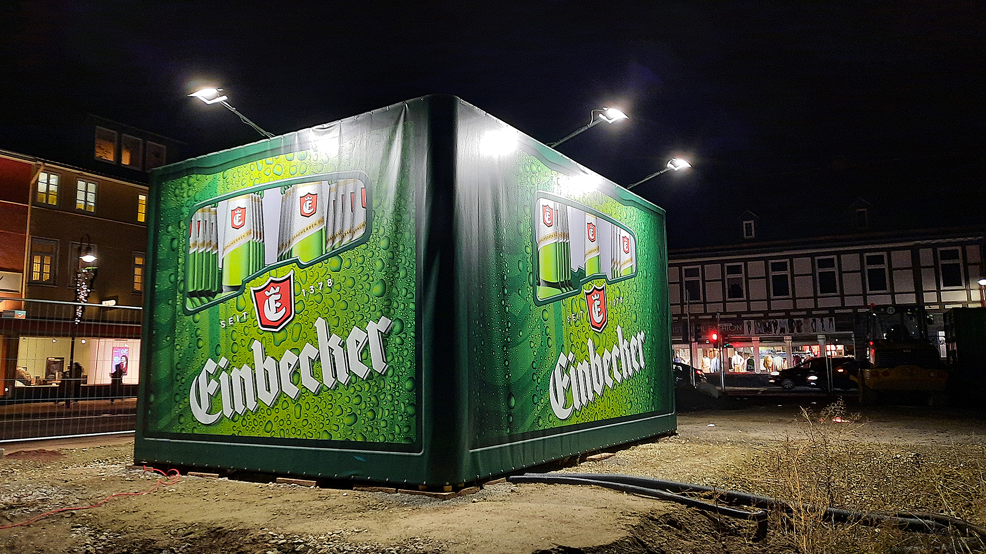 Gestaltet wurde der große Bierkasten vom Einbecker Messebau-Unternehmen Alex, welches die sich hinter der Hülle aus Lkw-Plane versteckende Trafostation mit einem Traversenbau einhauste und auf diese Konstruktion die Hülle mit dem Bierkasten-Druck zog. 6 Meter x 4,50 Meter x 3,35 Meter ist die Bierkiste XXL groß. Für Wartungsarbeiten am Trafo kann die Folienhülle natürlich gelupft werden. „Wir haben eine Brauherren-Pils-Kiste maßstabsgerecht vergrößert“, sagt Messebauer-Chef Hendrik Alex. Die Initiative war relativ spontan entstanden, für ein flexibles Messebauer-Team natürlich kein Problem.