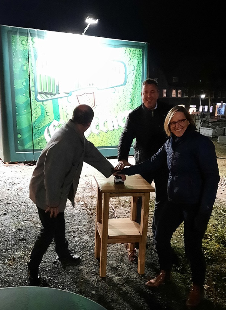 Für die einen ist es die größte Bierkiste Niedersachsens, für andere die schönste Hülle um eine Trafostation und für manche auch der markanteste Baustellenbau Einbecks: Auf dem Neustädter Kirchplatz vor den Toren der Brauerei ist jetzt ein überdimensionaler Bierkasten der Sorte Brauherren Pils ein Hingucker am Tage und dank Beleuchtung auch abends und in der Nacht. Brauhaus-Vorstand Martin Deutsch, Stadtwerke-Geschäftsführer Bernd Cranen und Bürgermeisterin Dr. Sabine Michalek drückten heute nicht nur symbolisch den Lichtschalter für die Einbecker-Bierkiste XXL.