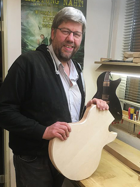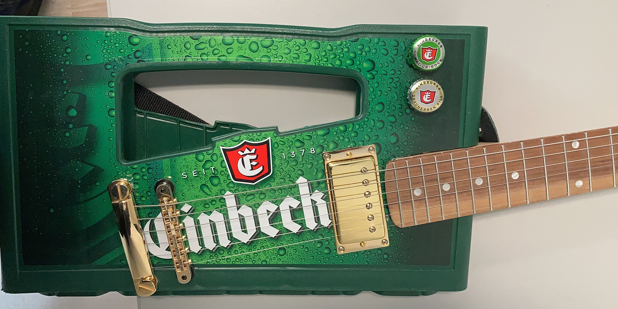 Gebaut hat die Einbecker-Bierkasten-Gitarre Lothar Meyer-Mertel, der Geschäftsführer des PS.Speichers in Einbeck. Der 61-Jährige ist seit jungen Jahren der Musik im Allgemeinen und Gitarren im Besonderen verbunden. Er verfügt nicht nur über eine ansehnliche Musikinstrumentensammlung mit über 70 Saiteninstrumenten, sondern restauriert und baut seit einigen Jahren in der Freizeit auch selbst Gitarren. Die Einbecker-Gitarre ist aus einer Sekt- oder besser Bierlaune heraus entstanden. Der Korpus besteht aus zwei Hälften einer originalen Bierkiste, die innen mit einem Holzkörper verstärkt ist, an dem der Hals montiert ist. Eine Herausforderung bestand darin, die verschiedenen Materialien – Kunststoff und Holz – miteinander zu kombinieren, erzählt Meyer-Mertek. Immerhin ist sie eine der wenigen Gitarren mit eingebautem Griff. Und trägt sich also wie eine Bierkiste.