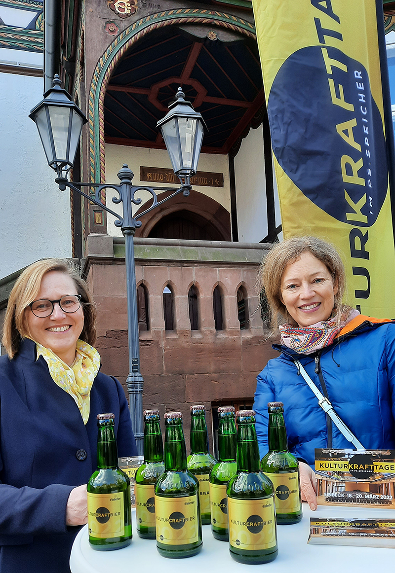 Der Durst ist groß. Der Durst nach leibhaftigen Kulturerlebnissen, nach Live-Konzerten, die nicht nur auf einem Bildschirm zu sehen sind. Sondern bei denen das Publikum die Kraft der Musik vor Ort direkt spürt. Im vergangenen Jahr war das neue Festival „Kulturkrafttage“ noch von der Pandemie ausgebremst worden. In diesem Jahr vom 18. bis 20. März aber wollen die Macher livehaftig in der PS-Halle in Einbeck durchstarten, Sprache und Musik verbinden und Begegnungen ermöglichen. Und dazu gehört natürlich das passende Einbecker Bier. In den eigens gelabelten Flaschen ist das Ainpöckisch 1378, der naturtrübe Bockbier-Genuss für die besonderen Anlässe. Auf dem Etikett die Wortverbindung Kulturkraft und Craft-Bier deutlich sichtbar. Und craft beer, handwerklich hergestelltes Bier, das gibt es in Einbeck schließlich schon seit 700 Jahren. „Einbecker Bier und die Kultur und die PS-Halle – das gehört einfach zusammen“, sagt die Künstlerische Leiterin der Kulturkrafttage, Julia Hansen, die sich gemeinsam mit Bürgermeisterin Dr. Sabine Michalek auf die Premieren-Veranstaltungen freut und den Möglichmachern dankt.