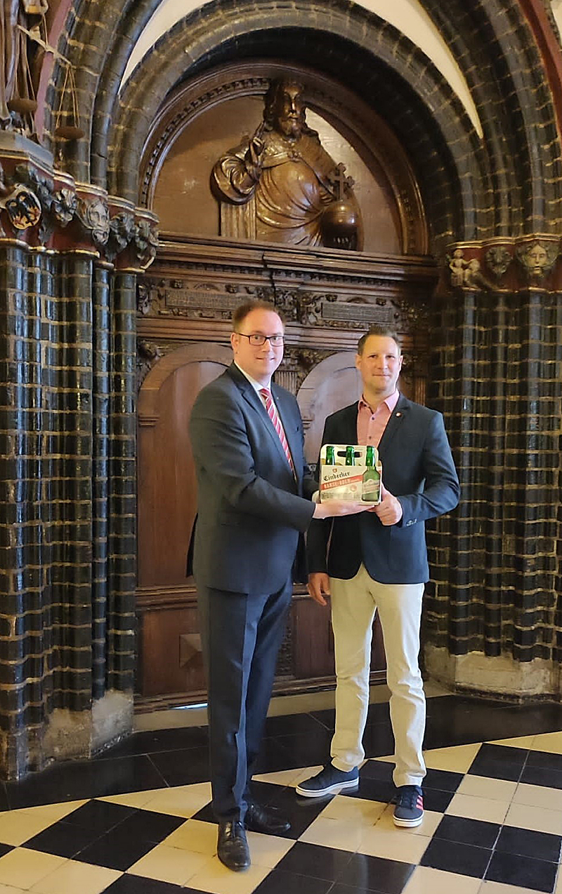 Die Erstabfüllung des „Hanse-Bock“ überreichte Sören Wolff in dieser Woche an Lübecks Bürgermeister Jan Lindenau, der zugleich Vormann des Städtebundes „Die Hanse“ ist. „Wie im Mittelalter befindet sich der Mittelpunkt der Hanse im Lübecker Rathaus. Ich freue mich sehr, dass ich den Hanse-Bock persönlich im ehrwürdigen Audienzsaal an den Vormann der Hanse übergeben kann“, wird Wolff in einer Pressemitteilung der Hansestadt Lübeck zitiert.