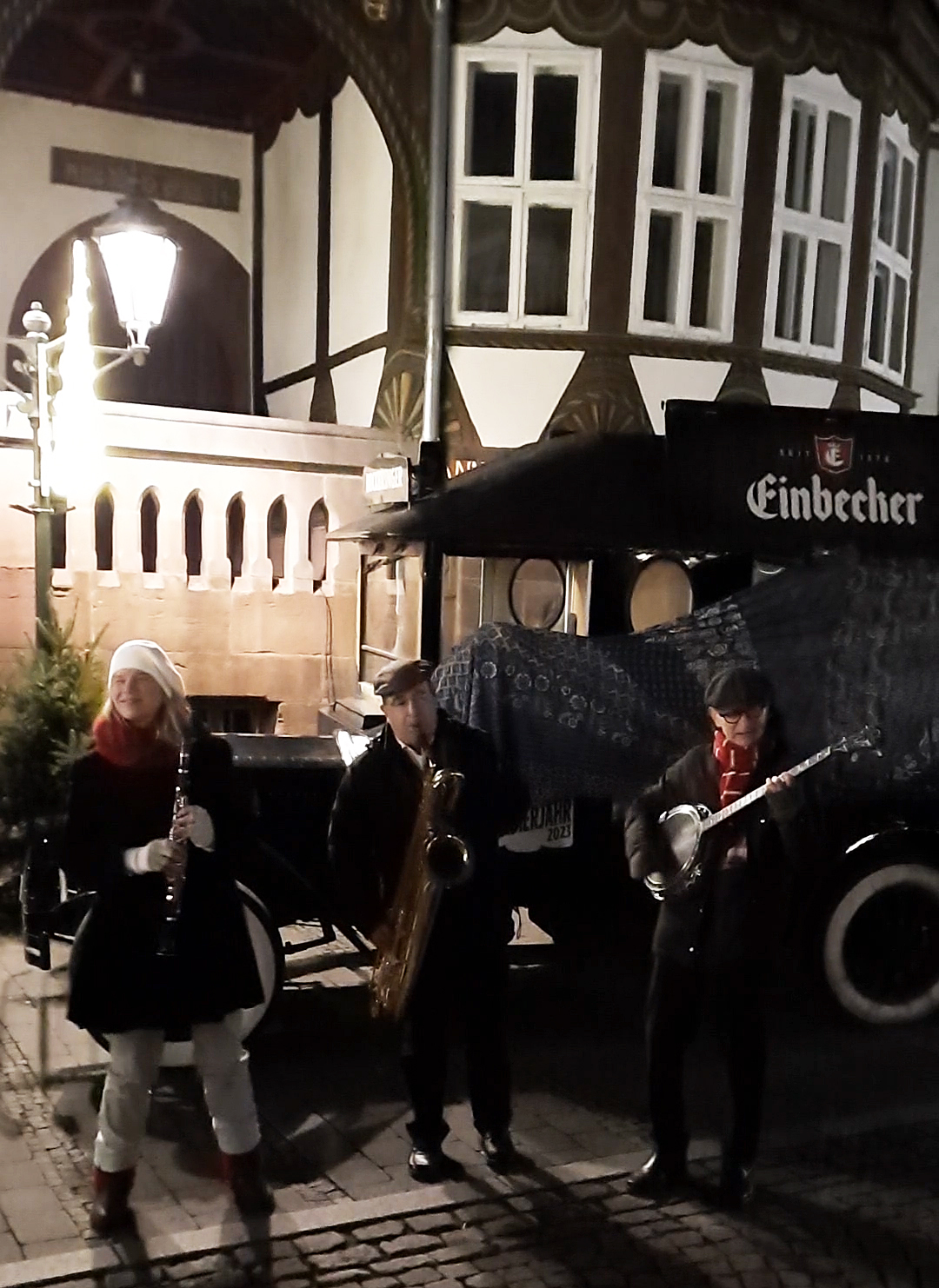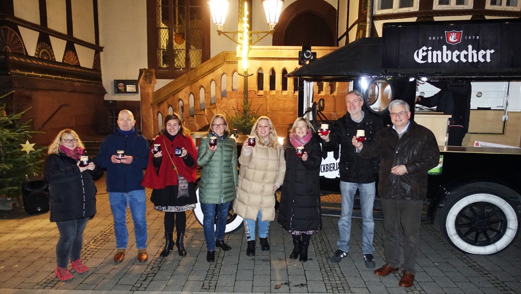 Aus Blaudruck wird Bockbier: Mit der offiziellen Übergabe zum nächsten Themenjahr heute auf dem Einbecker Weihnachtsmarkt hat das Bockbierjahr 2023 begonnen. Patricia Keil und Ingo Schrader zogen das Blaudrucktuch vom Bockbringer-Bierwagen, damit das Logo für das neue gemeinsame Themenjahr vieler Akteure erstmals sichtbar werden konnte. Einbecks Bürgermeisterin Dr. Sabine Michalek wünschte sich, dass sich ganz viele Partner hinter dem neuen Jahres-Thema aus möglichst vielen gesellschaftlichen Organisationen und Gruppierungen versammeln.