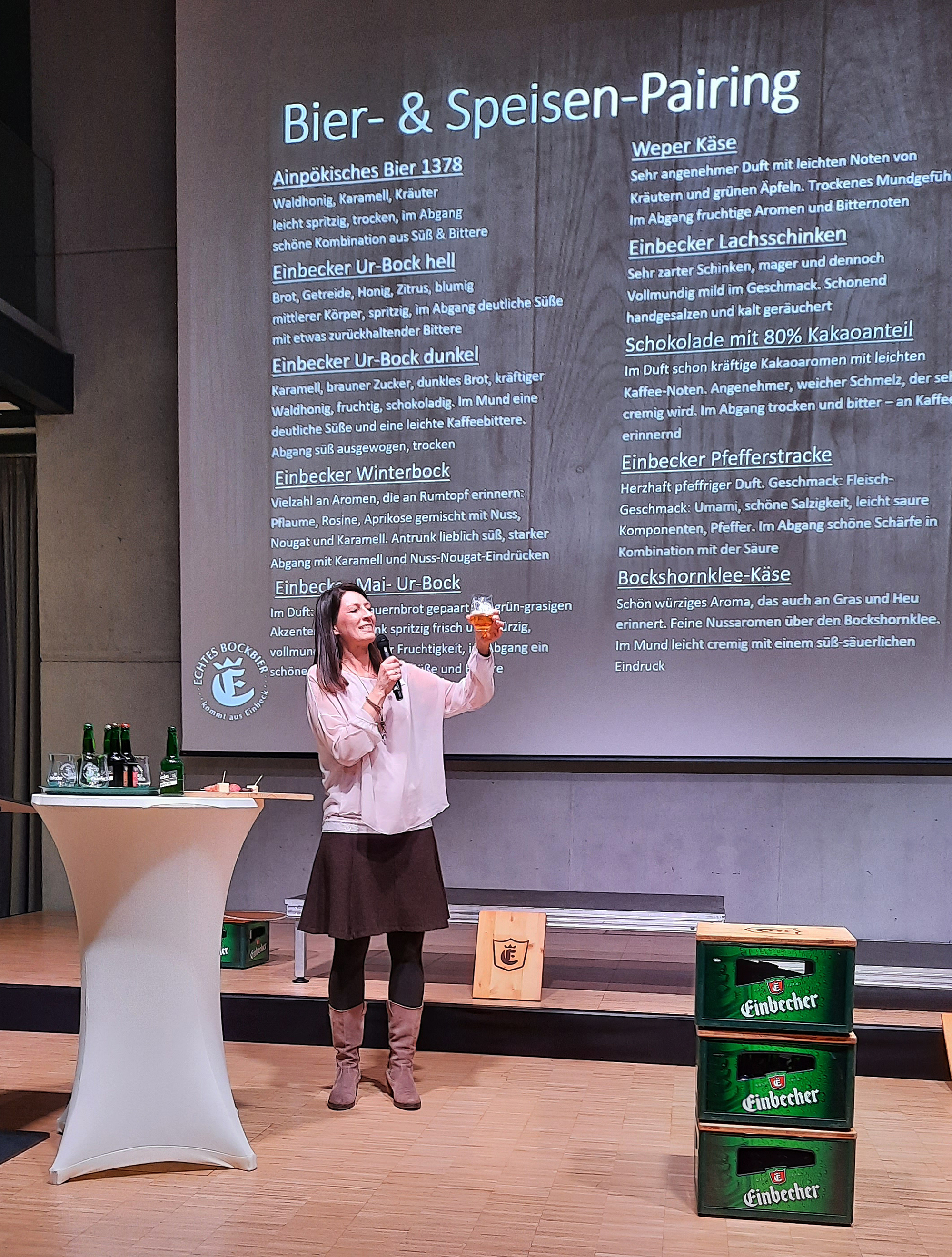 Zu Beginn des Bockbierjahres 2023 durfte beim Einbecker Neujahrsempfang natürlich in der Heimat guter Biere das Bockbier als beherrschendes Thema nicht fehlen. Die Veranstalter Einbeck Marketing und Stadt Einbeck hatten außer einem Balanceakt auf Bierflaschen auf ein Biertasting gesetzt. Biersommelière Jutta Knoll nahm die Herausforderung an, mit 250 Gästen ein Biertasting bzw. Foodpairing durchzuführen. Der ursprünglich angekündigte Biersommelier Hans Wächler musste kurzfristig absagen.