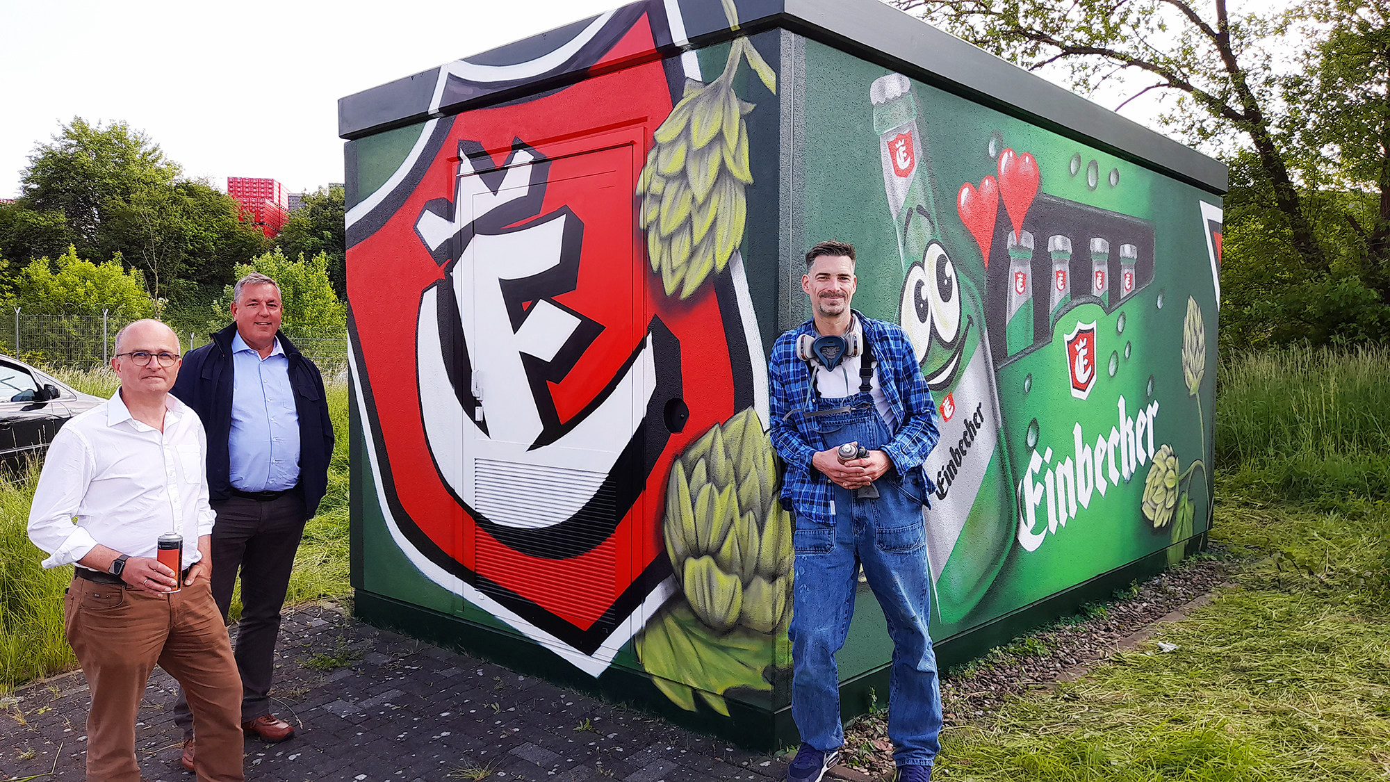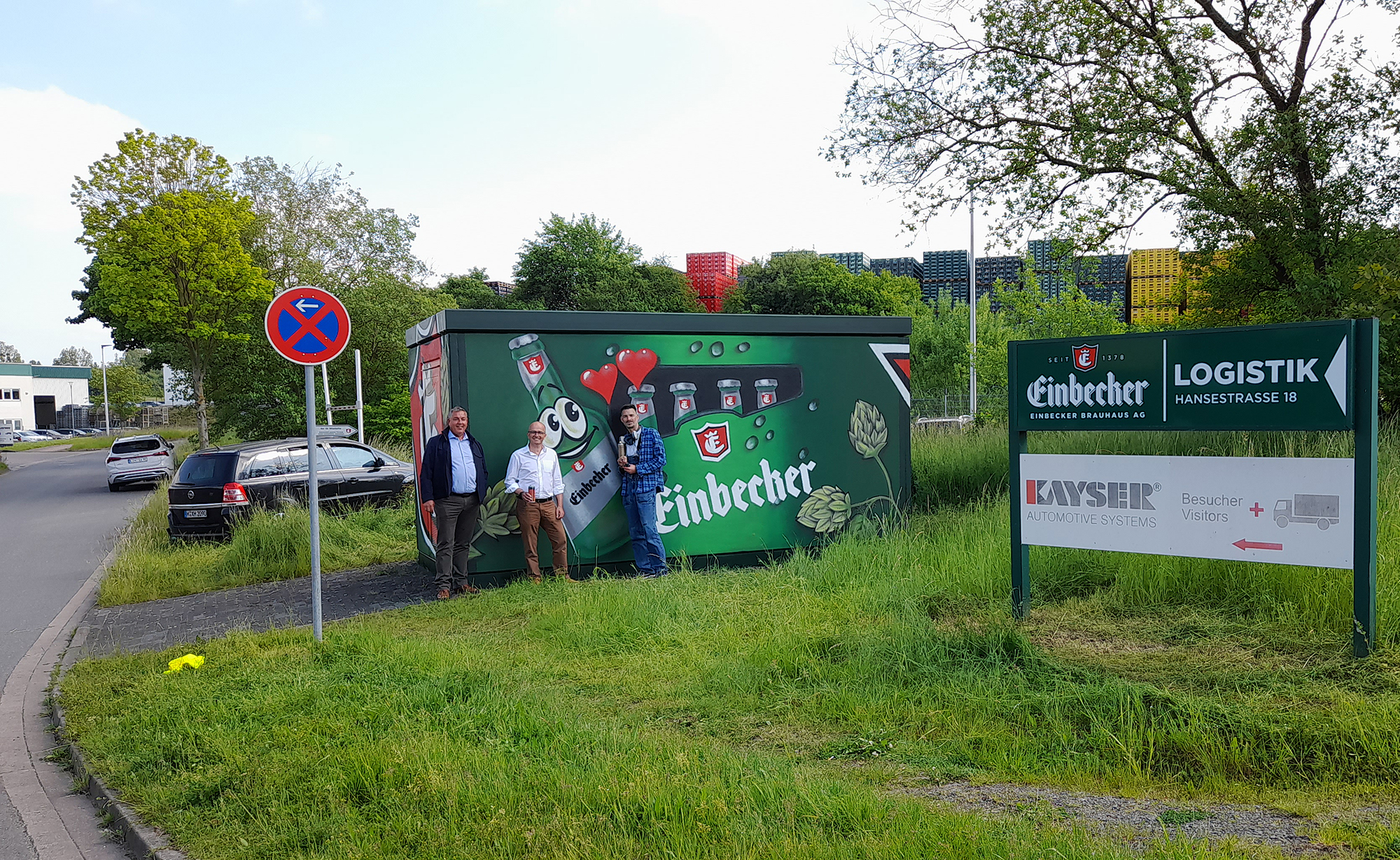 Die Trafostation der Stadtwerke, die an der Ecke Hullerser Landstraße zur Hansestraße auf dem Weg zum Logistikzentrum der Einbecker Brauhaus AG steht, war bereits grün. Jetzt aber ist das 3×5,40 Meter große Wandlungshäuschen von Mittel- auf Niederspannung ein echter Hingucker. Denn die Trafostation ist dank der Graffiti-Kunst von Volker Wruck zur Hopfen sprießenden XXL-Bierkiste geworden.