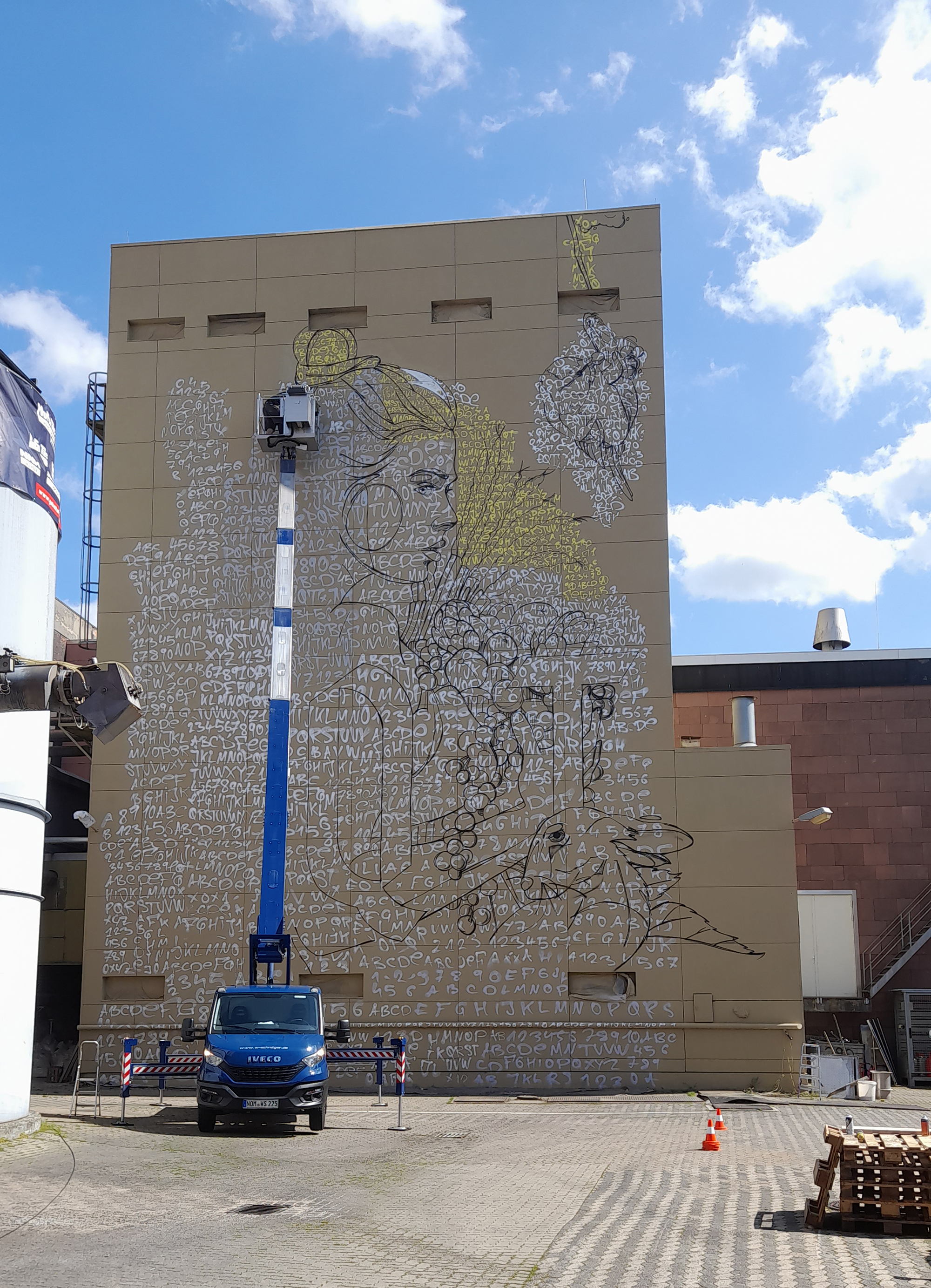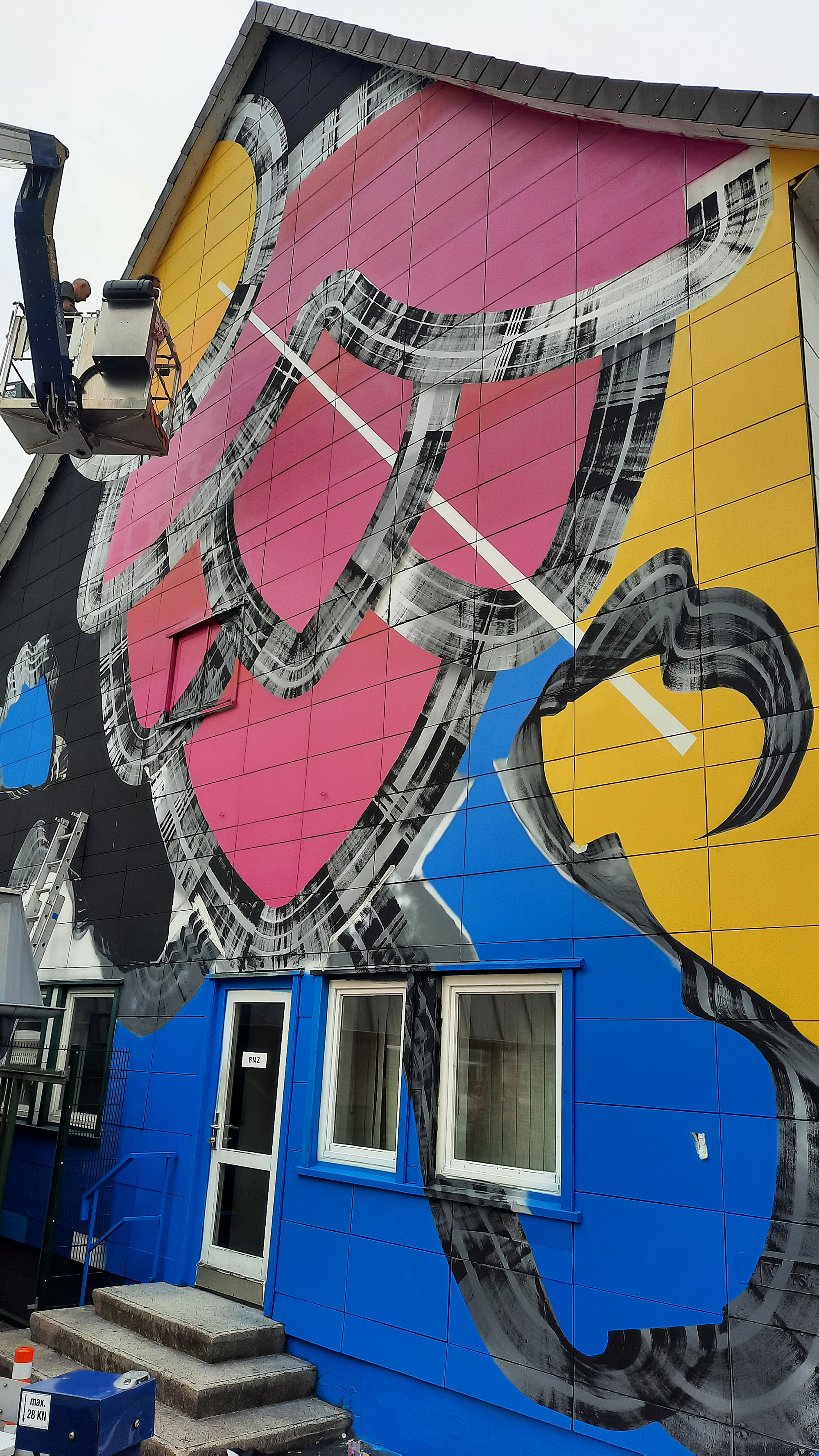 Björn von Schulz aus Münster hat während der BAM den 18 Meter hohen und 12 Meter breiten Siloturm künstlerisch gestalten dürfen, von der Hägerstraße aus wird das Mural jederzeit gut zu sehen sein. Ein paar Tage dauert’s noch, bis das Motiv komplett sein wird, das Wetter am Freitag hat nicht mitgespielt, der Untergrund war eine Herausforderung. Damit das Graffiti überhaupt dauerhaft hält, musste die Wand vorbehandelt werden, das übernahmen in schweißtreibender Arbeit Martin Keil und Christian Lorenz.