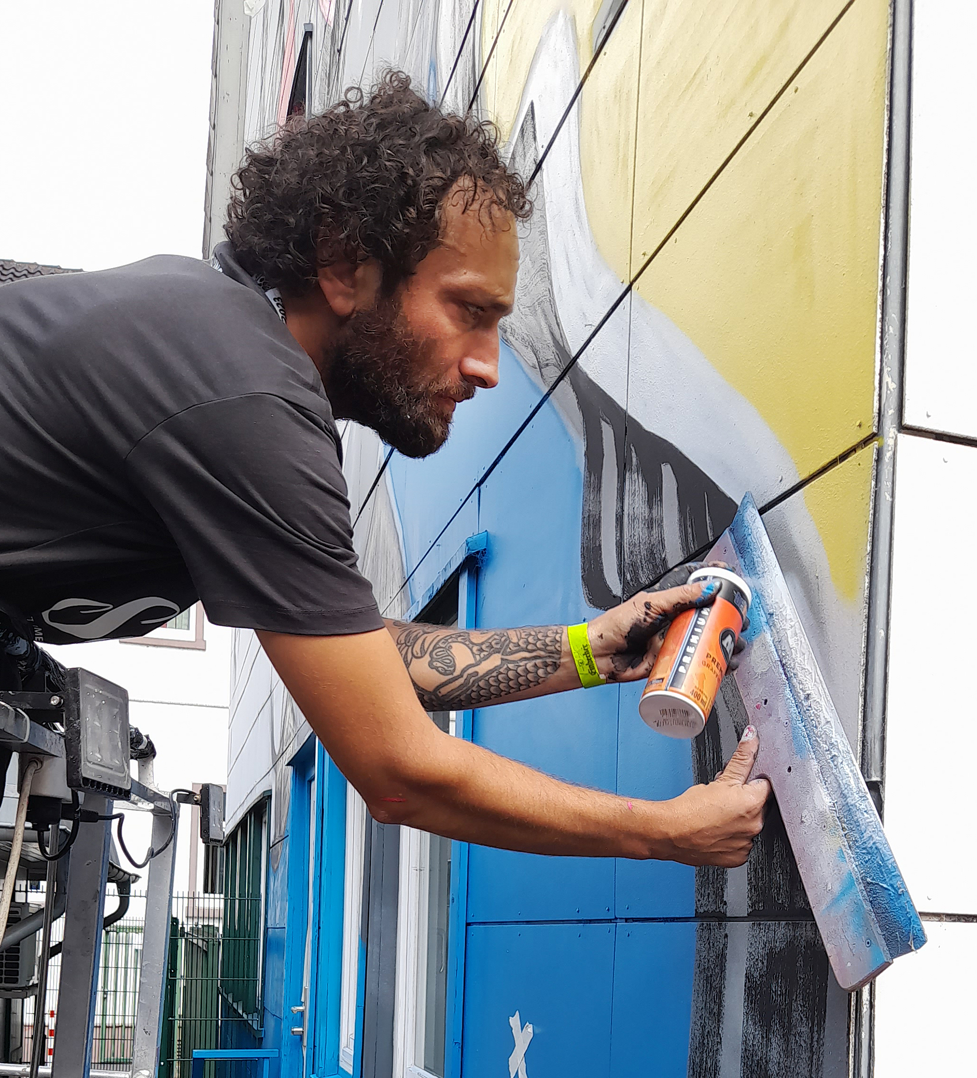 Engin Dogan, der sein Bild auf der zwölf Meter hohen Giebelwand hinter dem Empfangshäuschen gestaltet hat, kommt aus Aschaffenburg und ursprünglich aus dem Bereich der Kalligrafie, hat mittlerweile mit Graffiti und Acrylfarben seinen eigenen Stil entwickelt und ist international unterwegs. In Einbeck konnte er bereits 2020 ein temporäres Mural am Eingang zu einem Fitnessstudio am Kohnser Weg kreieren.