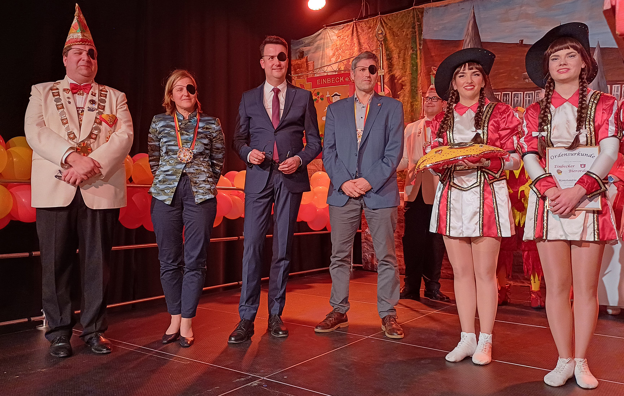 Eigentlich hat er ja einen Orden bekommen, den Einbecker Bierorden, die höchste närrische Auszeichnung, die in Einbeck zu bekommen ist. Am Ende seiner Dankesworte jedoch verteilte der FDP-Bundestagsabgeordnete Konstantin Kuhle mit einem Mal (nach närrisch-spontaner Absprache mit seiner SPD-Kollegin Frauke Heiligenstadt) in der Karnevalsbütt selbst gewissermaßen Orden – Symbole der Macht. Und zwar gleich mehrere. So weit hat es die Augenklappe, die der Bundeskanzler mal kurzzeitig tragen musste, inzwischen also gebracht.