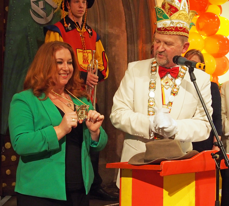 Ihren Hut aus dem Dschungelcamp lässt die neue Einbecker Bierorden-Trägerin Rebecca Siemoneit-Barum zugunsten des Einbecker Bürgerspitals versteigern. Karnevals-Präsident Albert Eggers (r.) freut‘s.